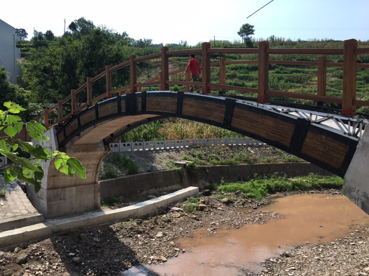 上部結構:微拱簡支梁橋,跨中矢高0.38m,矢跨比1/32,由3根縱梁和5道橫梁形成網格主梁,其上鋪就混凝土和竹板。