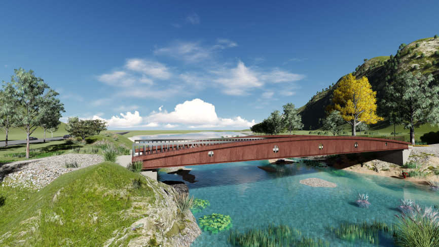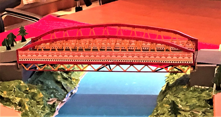 琢玉橋是希望之橋,載著孩子們的希望,帶著我們的祝福,翩然而來。鋼桁架拱橋的拱圈選用紅色防銹涂料,象征木瓜院村鎮道路曾是紅軍經過的紅色道路,也象征木瓜院村作為2017年度扶貧村落時得以脫貧致富的道路,也有黨的領導如絢麗彩虹給村民帶來希望、帶來光明的含義;防護欄桿上設計銀杏圖案,象征該村想要脫貧而新開發的銀杏產業園的興盛發展,希望此橋能夠協助山村重振當年茶馬古道的繁榮盛況。