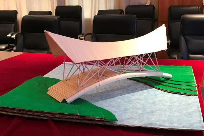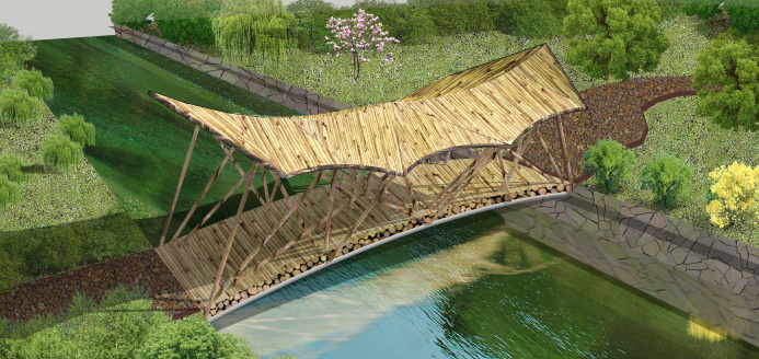云南省全境都盛產竹子,系我國乃至世界公認的竹類種質資源大省,特別是大型叢生竹類獨具特色和優勢。天然竹林類型及面積居全國第一位。梁河縣竹類繁多,是云南省主要的產竹地之一。用竹子作為本方案的主要材料,是真正的就地取材。使用了環保材料,不僅保護了云南省優美的自然環境,而且還降低了造價,符合公益橋的設計理念。在整體造型上橋梁的各部分組合,就像是一個輕盈的小舟,讓人充分領略到它的自由、靈動之美,寓意著云南梁河縣一帆風順的美好愿景。在設計目的上呼吁人們對于生態環境的關注。作為全國僅有的幾所林業類大學,東北林業大學對于生態以及資源問題尤為關注。在工業化高度發展的今天,各種工業材料帶來的資源浪費和污染已經成為了嚴峻的問題,所以我們應該學會使用節能環保材料,并發揮其性能。在云南,傣族人民占了很大一部分人口,在數千年的歷史沉淀中,傣族人民累積了豐富的竹材利用和建造的經驗,包括傣族竹樓,其基本都用竹材配合少許木料進行建造——以粗竹作結構梁、結構柱等承重構件,樓板則采用半劈開的竹子制作。所以使用竹子作為建筑橋梁的材料,是十分合適的。