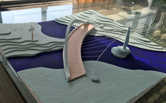 本橋靈感來源于苗族的銀項圈。如今的橋梁已不僅僅是起著交通作用了,橋的文化價值和藝術價值有著重要作用。為此,橋梁不能僅僅以滿足通行為目標,還要作為自然景觀的一部分融入到周圍自然環境里;作為文化積淀融入當地的文化中,更加強調橋梁融入環境,融入文化的意境。所以在造型上,既要與周圍融為一體,又要與當地的人文文化相呼應。材料上,用鋼材橋梁的主要材料,用混凝土澆筑橋梁的基礎部分,既保證了橋梁的安全性與耐用性,又不失自然美觀。色彩上,采用清淡的綠色為主,顏色組合盡量簡潔化,會更加貼近生態環境,親近自然。