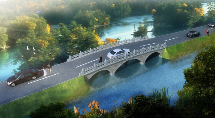 橋梁整體采用簡約、流暢、優美、安全等設計理念,努力將線形設計、結構要求、自然景觀及文化積淀等方面做到統一結合;橋型主體由直線、圓曲線與兩側連接構成,與傳統橋梁厚重的特點不同,力求線形纖細均勻,突出輕盈飄逸之感,從而與周圍幽雅安靜的自然環境相得益彰,具有較好的通透性與觀賞性,同時節省建筑原料,體現環保理念;從視野上盡力保留原自然景觀的游覽條件,不做過多的破壞與占用,深入貫徹習總書記“綠水青山就是金山銀山”的戰略思想。