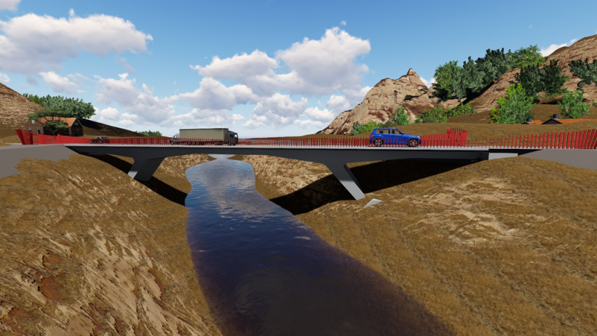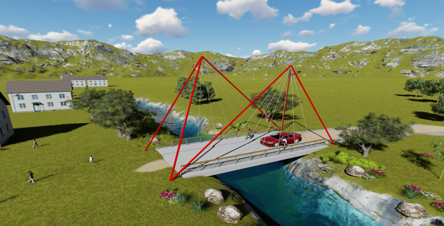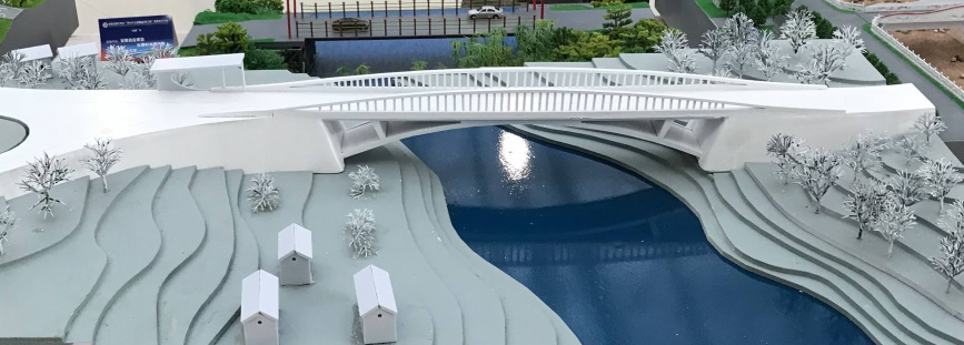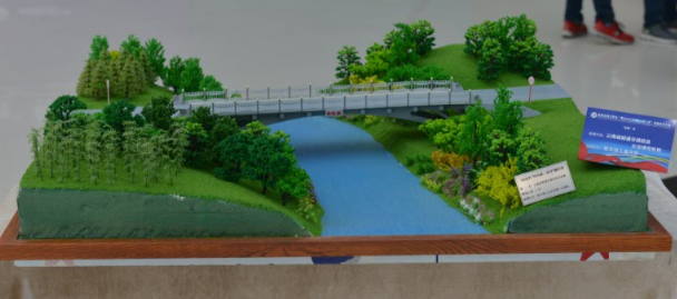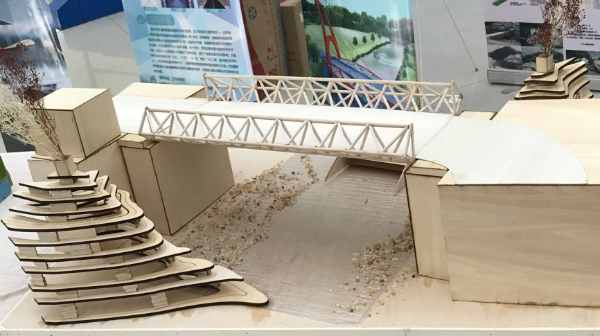 作品設計采用下乘式鋼桁架梁橋方案,設計構思新穎。方案創新性的將鋼桁梁橋的結構高度“搬到”橋面以上,使橋下過水空間最大化,提高了橋梁洪水抗災能。同時兩邊的鋼桁架既是橋梁受力的主體承重構件,也充當橋面護欄的作用,一舉雙得。