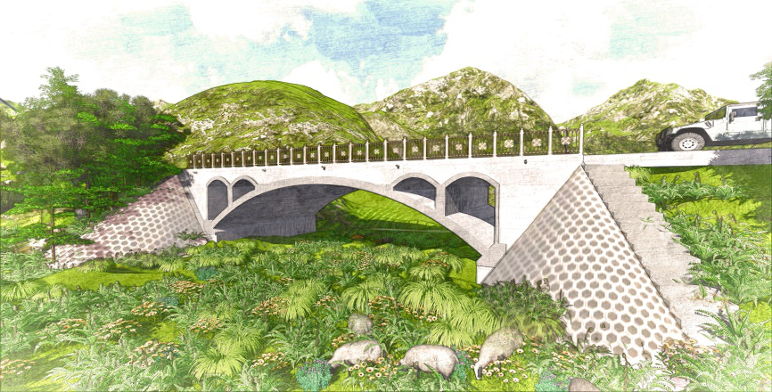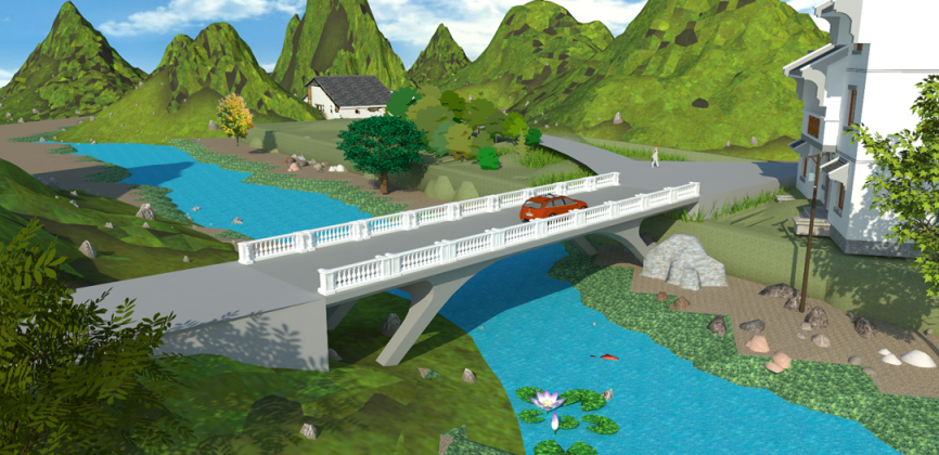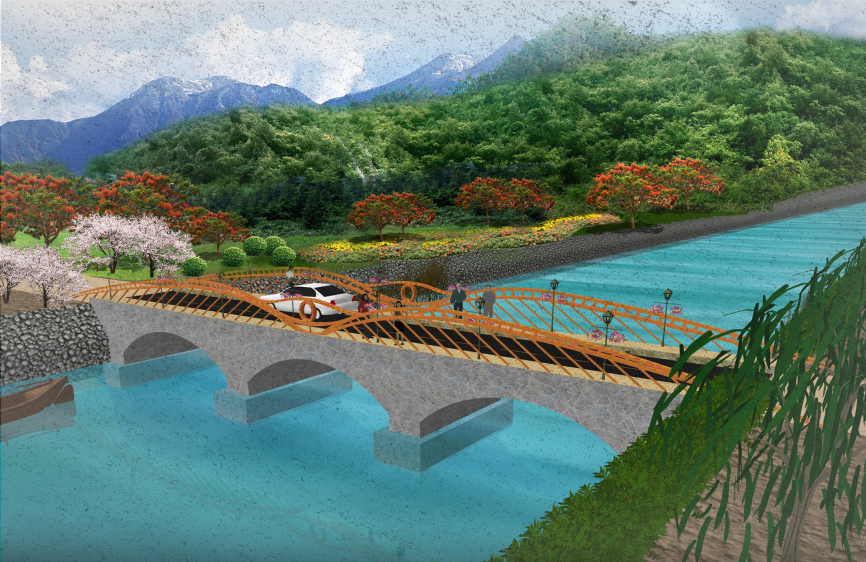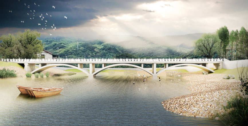 理念——尊重自然:優美的混凝土板拱橋與寧靜安謐的鄉村環境十分和諧,一跨過河的方案最大程度地減少了對自然生態的擾動。精準扶貧:我們致力于研究輕型板拱橋的經濟性和可實施性,為貧困山村提供一種安全可靠且經濟實用的公益小橋解決方案,并推廣到相同條件的廣大地區。回歸力線:簡潔流暢的輕型板拱橋使線條與力流完美融合。關懷人文:借用古代廊橋與風雨亭的理念,并且進行了鄉村通往城鎮的人流分析,我們設計了與拱橋線型相呼應的簡易休息亭,在人流匯集的橋頭拉近了人與人之間的距離,我們傳遞的溫暖讓鄉親們不再懼怕嚴寒和酷暑。