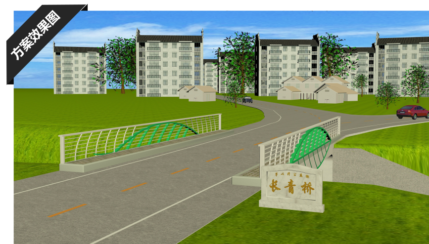 本次方案設計以“青岡樹葉”為景觀設計焦點,結合萬坊村兩岸現狀,力求將橋型融入兩岸風光中,打造成為萬坊村內的一個標志性景觀。本方案利用魚腹梁既有曲線與上部護欄構造,輔以外部裝飾,構建萬坊橋青岡樹葉之感,與周圍環境融合,組成了一幅青舍傍路半畝田,小橋流水共云閑的詩意畫卷。此橋被命名為長青橋,寓萬年長青,生生不息之意。