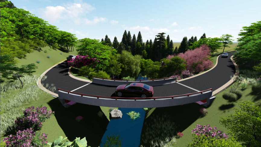 山區內秀麗壯美的自然風光本身就是最美的景色。在橋梁設計上,我們盡可能選擇輕薄的結構,將橋梁結構藏于景中,不喧賓奪主,將自然界最本真的美感展現在人們眼前,單跨鋼箱梁彎橋弧度優美,結構輕薄,無中墩阻擋視線。