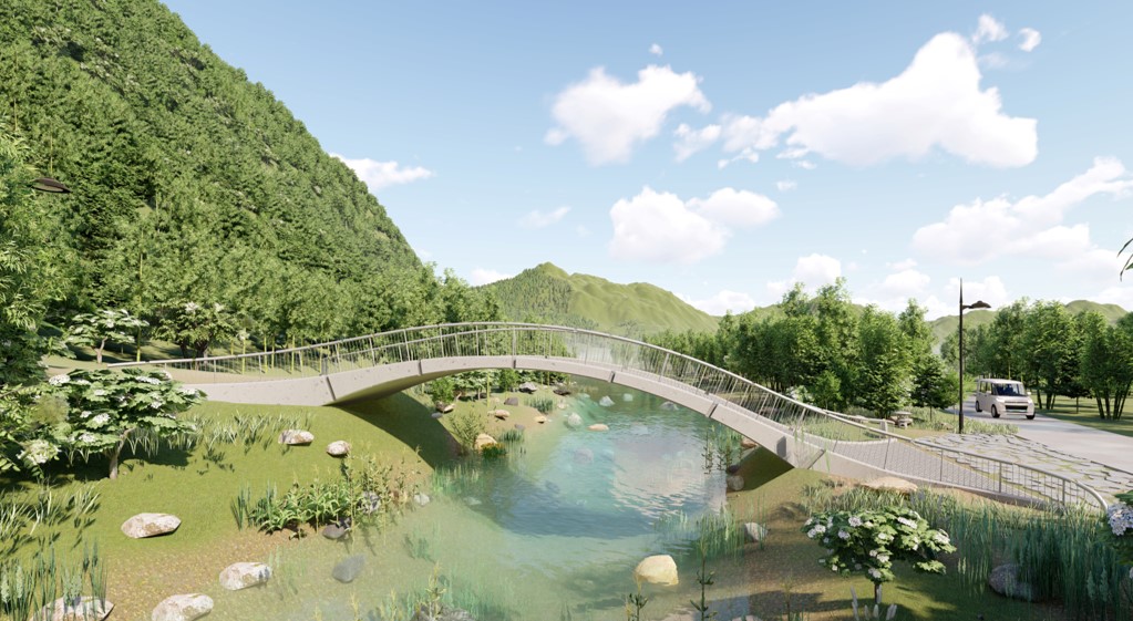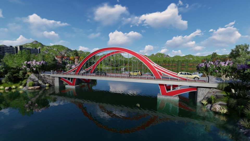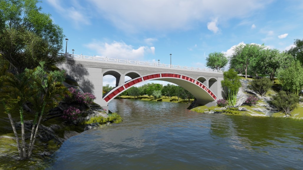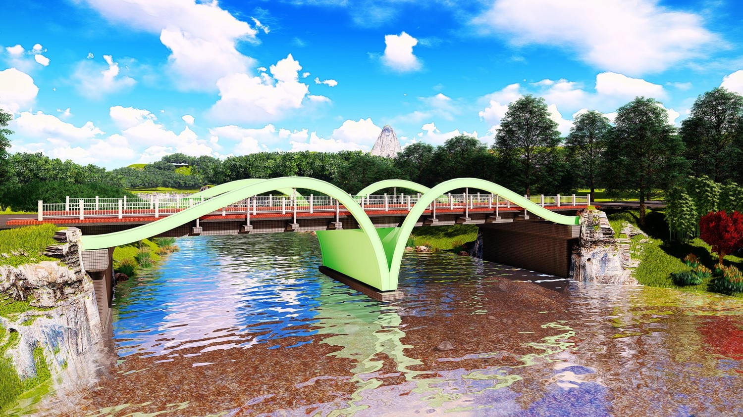 單跨實(shí)腹式現(xiàn)澆混凝土拱橋,以傳統(tǒng)苗族建筑屋頂曲線為創(chuàng)意思路,整體造型簡(jiǎn)潔樸實(shí),結(jié)構(gòu)簡(jiǎn)單取材方便,施工難度不大。