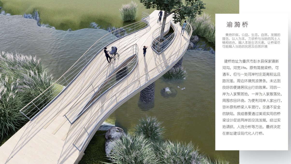 作品位于重慶奉節(jié)縣竹園鎮(zhèn)無山村,人行橋采用GFRP新型材料作為主梁,耐久、輕便、纖薄,易運(yùn)輸、易施工、易更換。