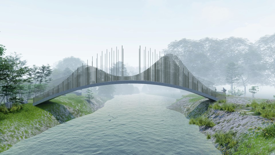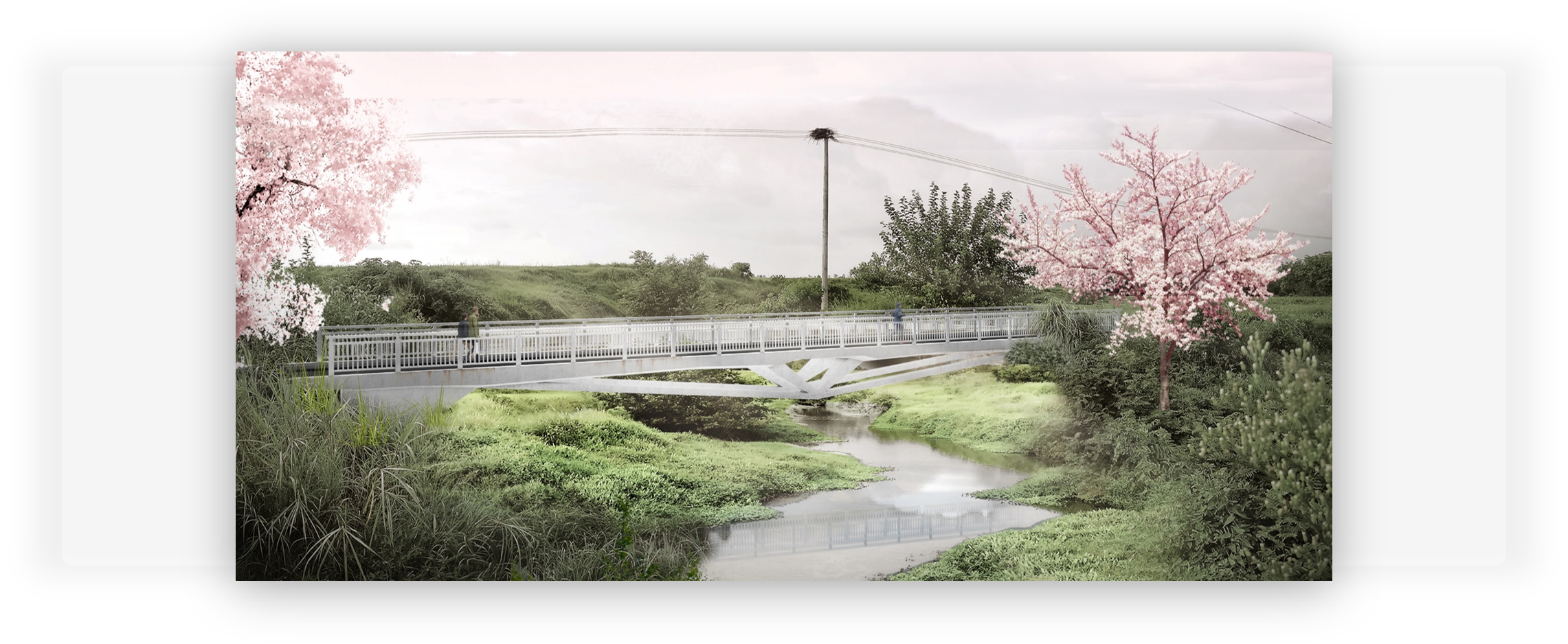 作品位于湖北省黃梅縣王寨村,橋跨布置為單跨41.4米體外預(yù)應(yīng)力混凝土鋼構(gòu)體系,v型轉(zhuǎn)向結(jié)構(gòu)固定體外預(yù)應(yīng)力新穎獨(dú)特。