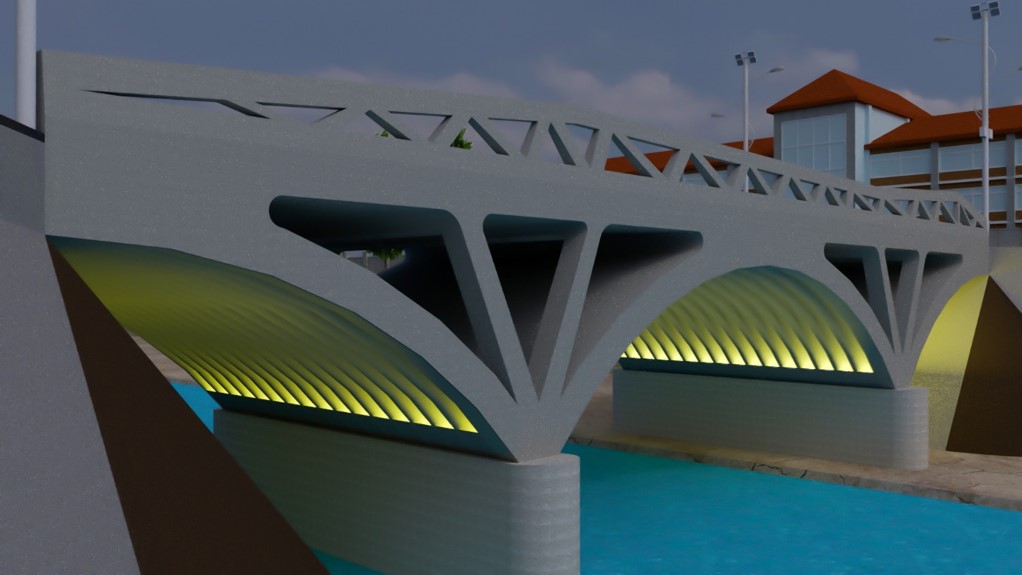 作品位于重慶市奉節(jié)縣白帝鎮(zhèn)大灣村河壩,新結(jié)構(gòu)基于現(xiàn)場(chǎng)已有橋墩和橋臺(tái)建造,跨徑布置為15m+20m=35m,上部結(jié)構(gòu)采用應(yīng)力帶橋的形式,CFRP代替?zhèn)鹘y(tǒng)鋼筋作為橋梁承重帶,最大程度減輕橋梁自重,材料耐腐蝕、抗疲勞性能好。