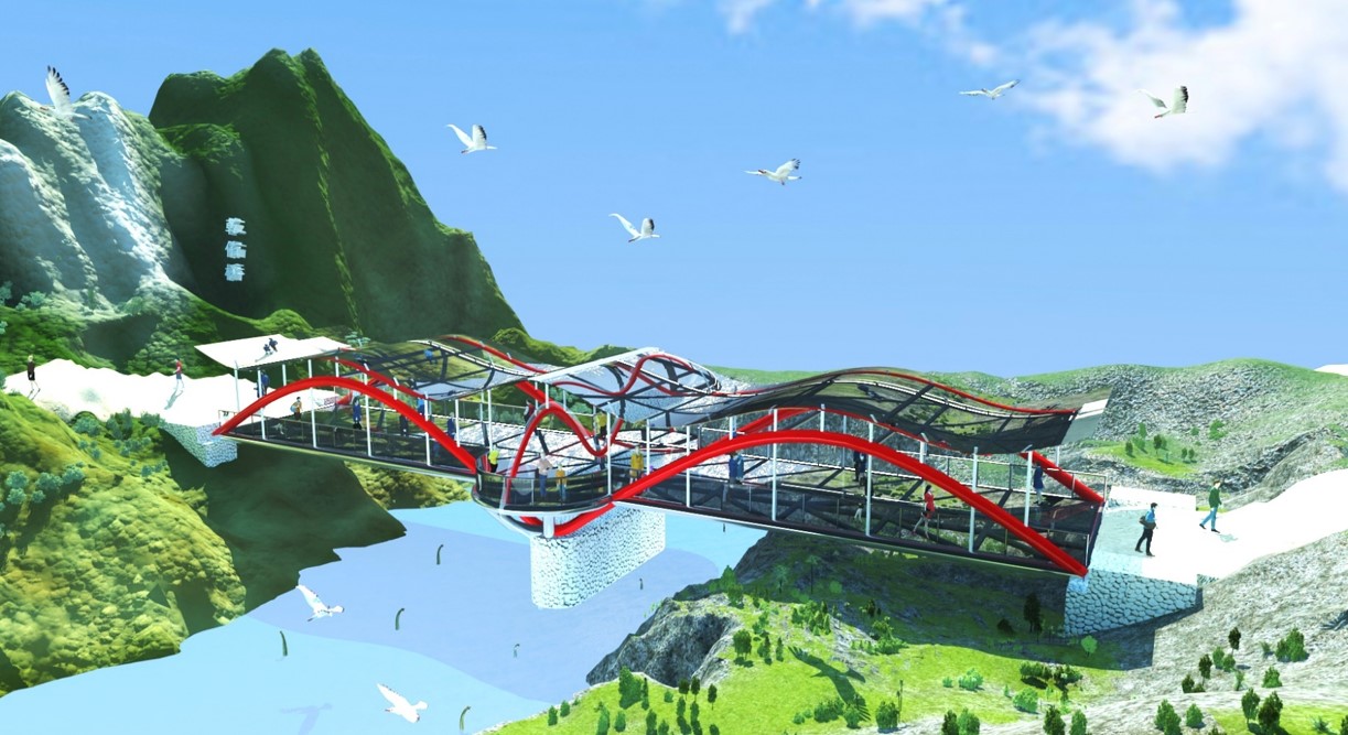 欄桿采用鋼化玻璃,其靈感來自于當(dāng)?shù)厝荷江h(huán)繞的地理環(huán)境以及苗族蘆笙作為苗族傳統(tǒng)文化代表,將其排列形式抽象出曲線形狀。
