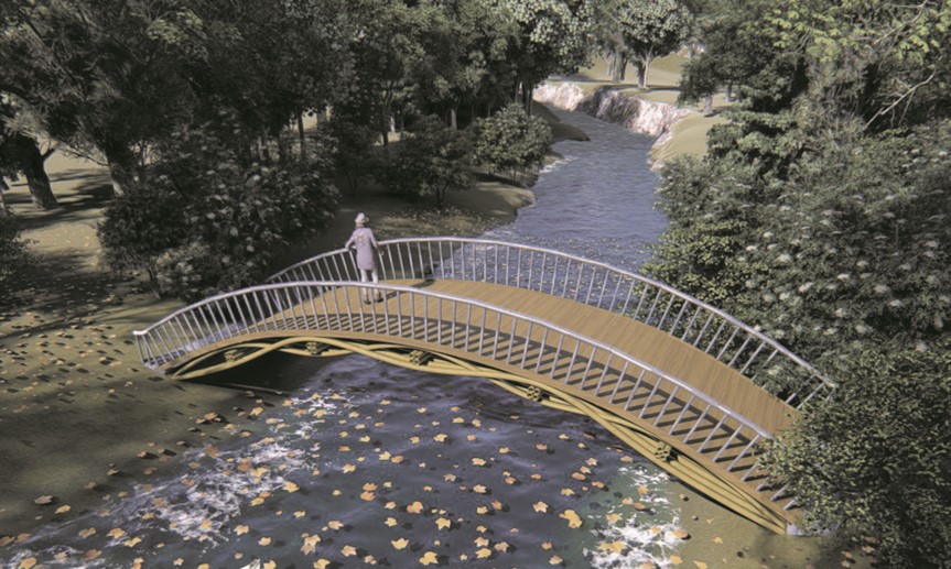 作品位于重慶市奉節(jié)縣白帝鎮(zhèn)大灣村,人行橋采用下承式鋼管混凝土拱橋結(jié)構(gòu),全長(zhǎng)35m,橋跨布置為2×17.5米,橋面寬7m。
