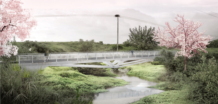 該橋充分體現(xiàn)了人性化設(shè)計(jì)的特點(diǎn),結(jié)合當(dāng)?shù)匕撞栉幕⒅煨筒捎貌枞~型仿生形態(tài),并采用CFRTP連續(xù)纖維增強(qiáng)熱塑性復(fù)合材料。橢圓扶手,體現(xiàn)以人為本的理念。