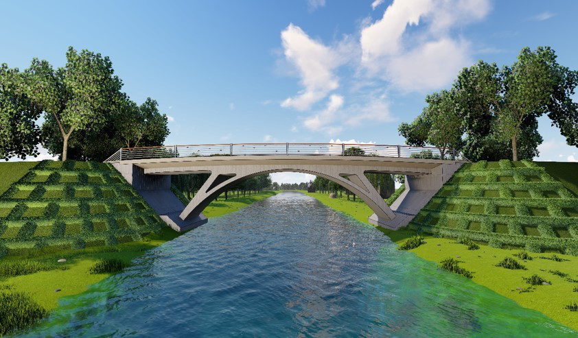 該橋的亮點(diǎn)是拱圈采用非常規(guī)的二次拋物線,別樣的拱圈似一抹綠葉輕浮在水面上,為鄉(xiāng)村增添別樣的色彩。
