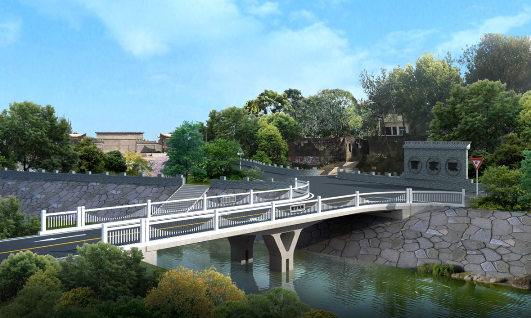 橋梁為單跨19.7米上承式鋼筋混凝土拱橋,橋?qū)?米。