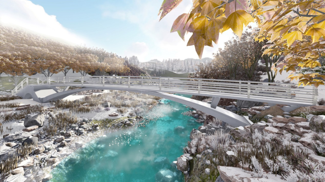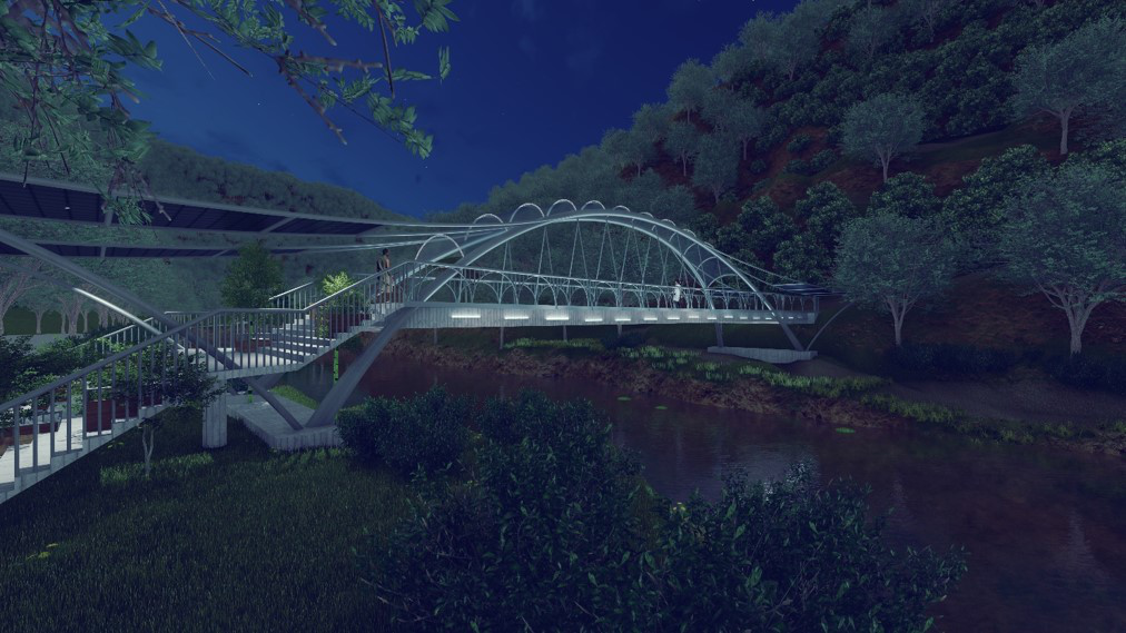 該橋的亮點(diǎn)是輕巧玲瓏,和環(huán)境有機(jī)的融為一體,經(jīng)濟(jì)適用,凸顯公益的理念。