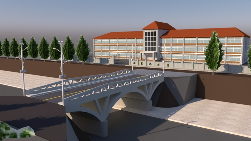 橋梁的拱券部分形似兩本翻開(kāi)的書,承載著橋面以及橋上的行人,象征著孩子們借助書本的力量走出學(xué)校、走向社會(huì),成為社會(huì)主義現(xiàn)代化建設(shè)的接班人。