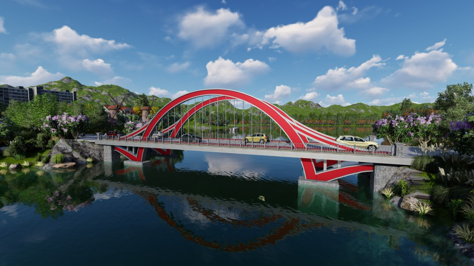 單跨實(shí)腹式現(xiàn)澆混凝土拱橋,以傳統(tǒng)苗族建筑屋頂曲線為創(chuàng)意思路,整體造型簡(jiǎn)潔樸實(shí),結(jié)構(gòu)簡(jiǎn)單、取材方便,施工難度小。