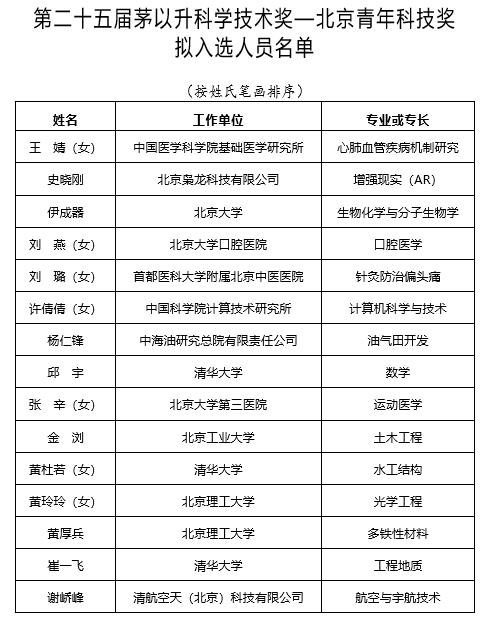 根據《茅以升科學技術獎—北京青年科技獎條例》《茅以升科學技術獎—北京青年科技獎條例實施細則》有關規定和《關于開展第二十五屆茅以升科學技術獎—北京青年科技獎評選工作的通知》有關要求,經評審委員會初評、終評,王婧等15人擬入選第二十五屆茅以升科學技術獎—北京青年科技獎。