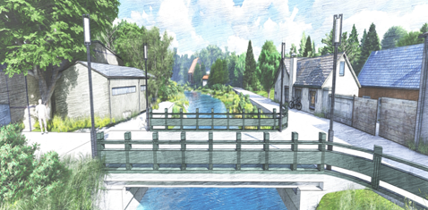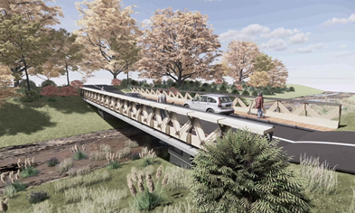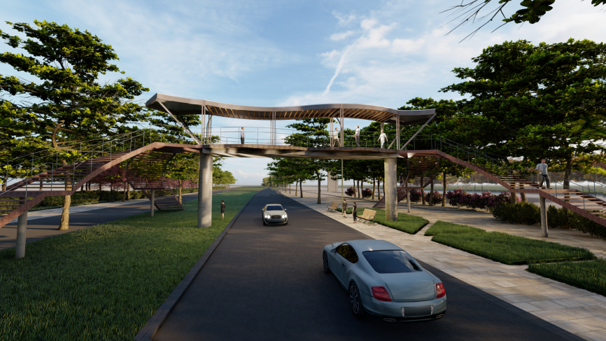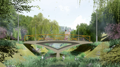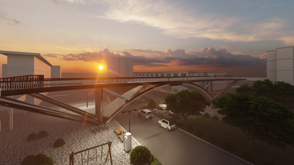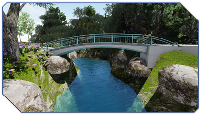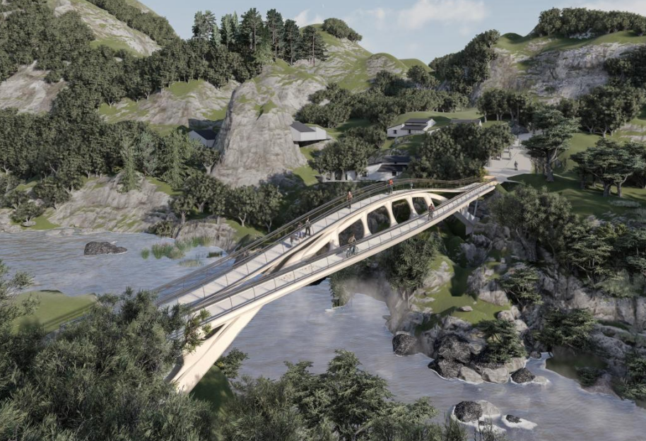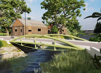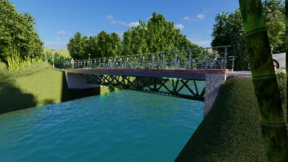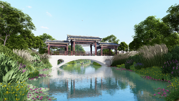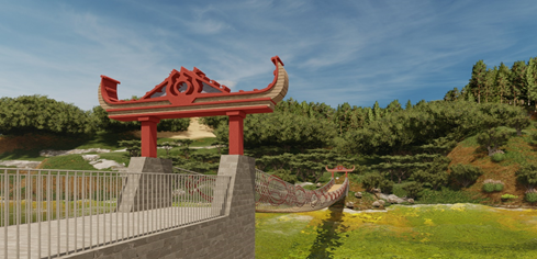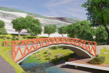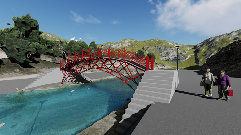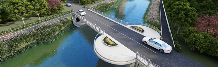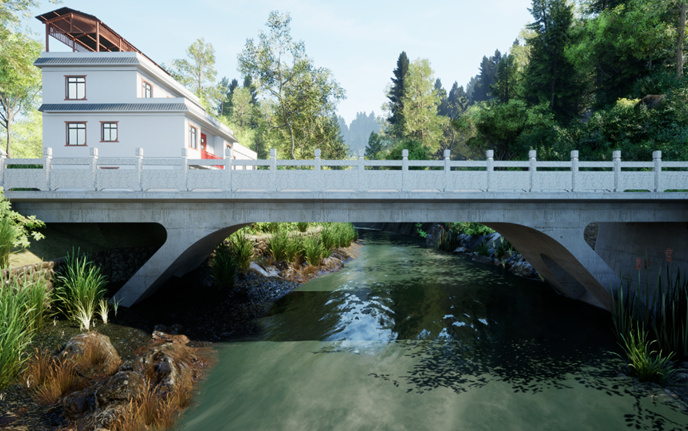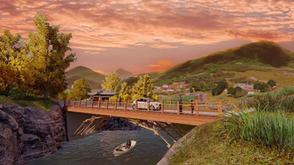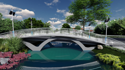 此方案命名為“安善橋”,“安”取自通安村,有安寧、祥和之意;“善”諧音“扇”,取榮昌特色——折扇為主要設計元素,“善”亦有上善若水之意,期望此橋能如水滋潤萬物一般為通安村的振興“錦上添花”,成為該村旅游發展的標志之一。將安與善結合在一起,安善,有安吉安好之意。