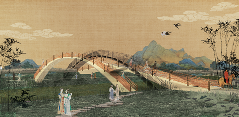 橋體以編織作為母題,借鑒清明上河圖中的虹橋的疊梁拱結構,在保證結構受力合理的同時保持生態美觀。橋面的紋路根據坡度變化而變換密度,產生韻律,起到裝飾且防滑的作用。欄桿根據高度變化鏤空有所變化,中間稀疏而兩端稠密,既保證安全又有助于泄洪。