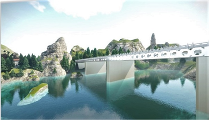 雙墩平拉索橋,通過鋼索面連接兩端,大大減少了主梁的高度,施工更簡單,材料運輸方便,后期維護簡單。全橋具有一定的流線型結構,造型美觀,體現彝族特色。欄桿圖案采用了當地刺繡的基本圖案,波浪的總體流線,交叉之后的圖案是彝族刺繡中象征動物中的羊角,體現了當地村民對家中畜牧業發展的良好祝愿。門頭圖案采用一種屋檐的做法,采用紅色主色調,體現學生的朝氣蓬勃,也是對當地學生今后發展的美好希望,同時整體造型采用了當地彝族建筑的屋檐造型,通過這種方式融入村民的文化交融中。