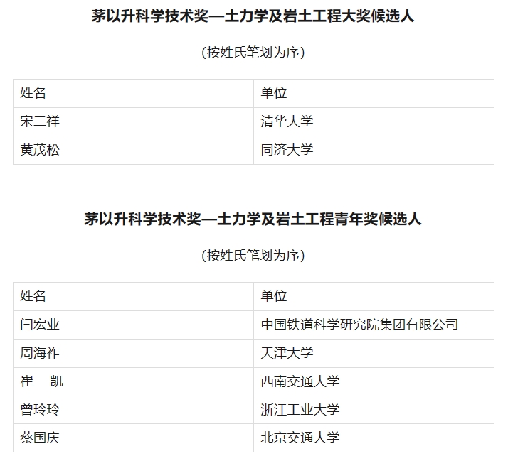 第十六屆“茅以升科學技術獎—土力學及巖土工程大獎”、“茅以升科學技術獎—土力學及巖土工程青年獎”評審會于2024年12月6日在北京召開。根據《茅以升科學技術獎—土力學及巖土工程大獎實施細則》、《茅以升科學技術獎—土力學及巖土工程青年獎實施細則》等規定,由北京茅以升科技教育基金會、中國土木工程學會、土力學及巖土工程分會相關專家組成評審委員會。本屆大獎、青年獎經過推薦申報、資格審核、專業預審、評審委員會終審等程序,共評選出大獎候選人2名、青年獎候選人5名,現將評審結果向社會公示。