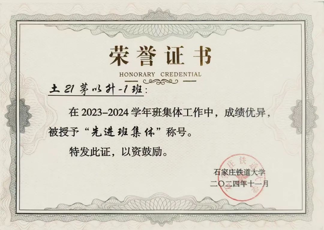 “不積跬步,無以至千里”,土21茅以升-1班以點滴耕耘鑄就卓越篇章。在集體榮譽方面,本班先后斬獲“校級先進班集體”2次、“校級五四表彰先進團支部”1次;在個人榮譽方面,獲評國家獎學金、茅以升鐵道教育希望之星等國家級榮譽11項、省級榮譽1項、校級榮譽7項;在學科競賽中,累計榮獲國家級獎項18人次、省級獎項21人次、校級獎項59人次;在科創成果方面,授權發明專利5項,實用新型專利2項、外觀設計專利1項,發表學術期刊論文1篇,完成大學生創新創業訓練項目8項。土21茅以升-1班正以扎實足跡詮釋新時代工科班級的奮斗精神。