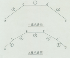 二組示意圖所示,由桿件③、④、④’、⑤、⑤’和桿件B、B’以及桿件C和C’組成,其立面呈五邊折線形。桿件③是承受勻布荷載的“梁”,桿件④和④’是兩排斜置(傾斜度相同、傾斜方向相對)承受直壓力的“柱”,桿件⑤、⑤’也是兩排斜置(傾斜度相同而傾斜方向相對)承受直壓力的“柱”。桿件B、B’(扁方木)和桿件C、C’(扁方木)皆是橫向連接的墊木。