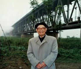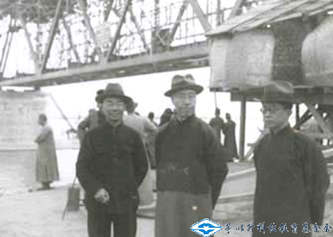 抗戰勝利后,茅以升組織班子重修了大橋。1949年5月3日,蔣軍湯恩伯部撤離杭州時,又炸壞了橋面一部分。新中國建立后,茅以升又一次修橋,使錢塘江大橋又重新通車。圖為1987年錢塘江大橋通車50周年時,茅以升故地重游。