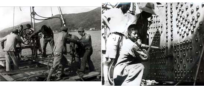 茅以升與錢塘江橋總工程師羅英在建橋工地上。