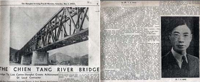 1933年,茅以升就任錢塘江橋工委員會主任,提出了《錢塘江橋建設計劃書》。隨后,擔任錢塘江橋工程處長,主持建造錢塘江大橋。錢塘江大橋,是第一座由中國人自己設計并主持建造的近代化鐵路、公路兩用橋。該橋在工程技術上的成就,增強了國人在橋梁結舌方面的信心,令國外同行對中國的橋梁建筑工程師刮目相看。錢塘江大橋的建成,改善了浙江南北的交通狀況,在抗日戰爭的關鍵時刻,為支援淞滬抗戰,疏散民眾,轉移戰略物資,保存我方有生力量,做出了巨大貢獻。建國后,仍然在國民經濟建設中繼續發揮作用。