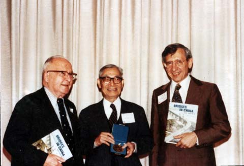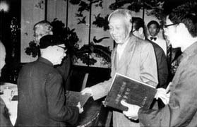 1978年3月,茅以升出席全國科學大會,是中央電視臺向全世界介紹的七位科學家之一。 圖為茅以升回到鐵道科學院時受到熱烈歡迎的情形。 ![]() 1979年6月28日,美國卡利基—梅隆大學理工學院授予茅以升“卓越校友”獎章。 圖為該校負責人與茅以升合影留念。 |