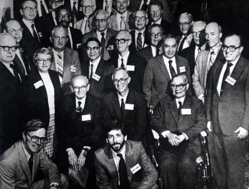 70年代末,茅以升與科學家華羅庚、朱物華等合影留念(前排右二為茅以升) |