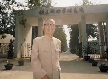 ![]() 八十年代、茅以升在任職三十余年的鐵道科學研究院門前留影 |