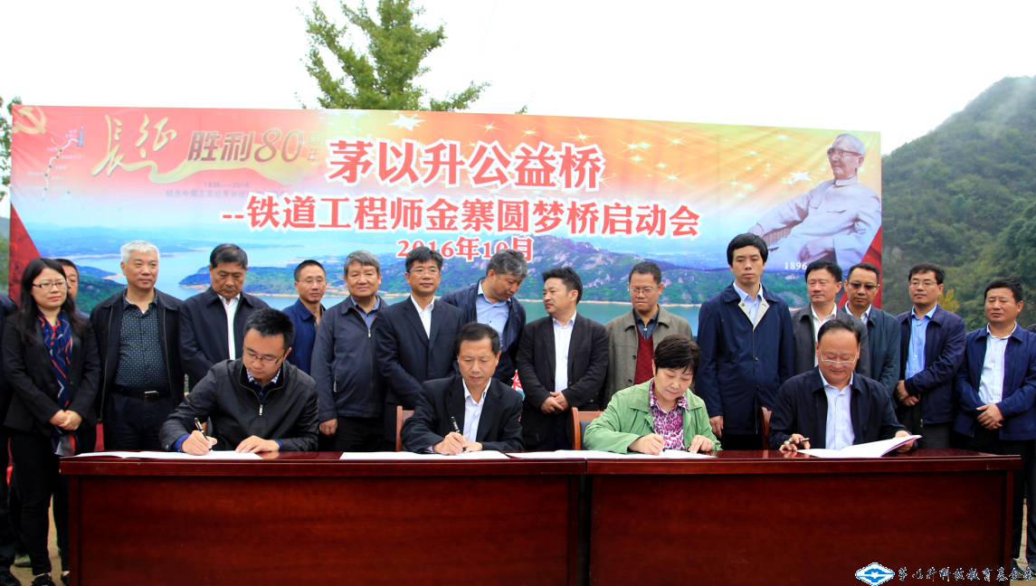 2016年10月20日,為紀(jì)念中國工農(nóng)紅軍長征勝利80周年,“茅以升公益橋——鐵道工程師金寨圓夢(mèng)橋”在紅色革命根據(jù)地大別山區(qū)的金寨縣鐵沖鄉(xiāng)高畈村皂河舉行啟動(dòng)儀式。北京茅以升科技教育基金會(huì)秘書長茅玉麟,中國鐵路總公司工程管理中心副主任盛黎明,中國鐵建股份有限公司總工程師雷升祥,中國鐵道學(xué)會(huì)辦公室主任劉華,中鐵上海設(shè)計(jì)院集團(tuán)公司董事長李永利,金寨縣委常委,副縣長程?hào)|中及相關(guān)單位負(fù)責(zé)人出席了啟動(dòng)儀式。