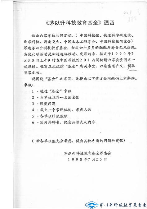 北京茅以升科技教育基金會由:中國科技館、鐵道科學研究院、北京市科協、西南交通大學、中國土木工程學會、中國科技報研究會六家單位共同發起出資籌建的。