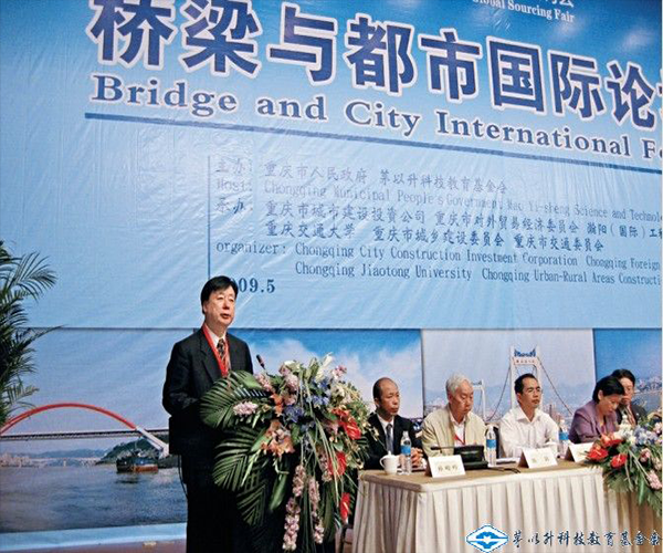 2009年5月,由重慶市人民政府和基金會共同主辦的“橋梁與都市國際論壇•重慶2009”順利召開。圖為鐵道部原副部長、基金會第一副主任孫永福院士致辭。