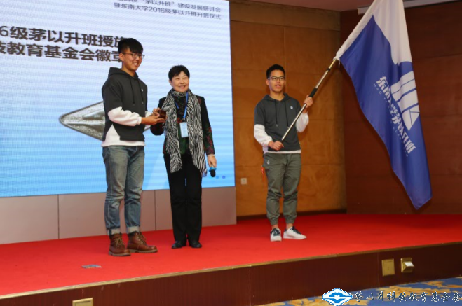 在東南大學新一期茅以升班的開班儀式上,茅玉麟秘書長向東南大學贈送了《茅以升全集》,向東南大學新一期茅以升班授旗,并贈送茅以升科技教育基金會徽章。任利劍副書記代表東南大學向茅以升科技教育基金會贈送了紀念文集和東南大學茅以升班班徽。